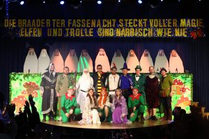 Am Fastnachtssamstag stieg die diesjährige Kappensitzung des TuS Breithardt in der restlos ausverkauften Breithardter Narrhalla, die auch in diesem Jahr wieder besonders festlich geschmückt war. Mithilfe beeindruckender Beleuchtungstechnik wurden Bühne und Narrhalla in den Fastnachtsfarben rot, weiß, blau und gelb illuminiert. Die Besucher, viele als Feen, Zwerge, Trolle, Hexen oder Zauberer verkleidet, betraten zunächst durch einen Bogen aus Luftballons im Eingangsbereich die Narrhalla, um sich anschließend im Braaderter Abenteuerland bestens unterhalten zu lassen. Während die Bühne als verwunschenes Abenteuerland mit Liebe fürs Detail kreativ gestaltet war und an den Seitenwänden mystische Bilder von Feen, Wölfen und Einhörnern hingen, wurde der Thekenbereich kurzerhand in „Hexenküche“ umbenannt.
